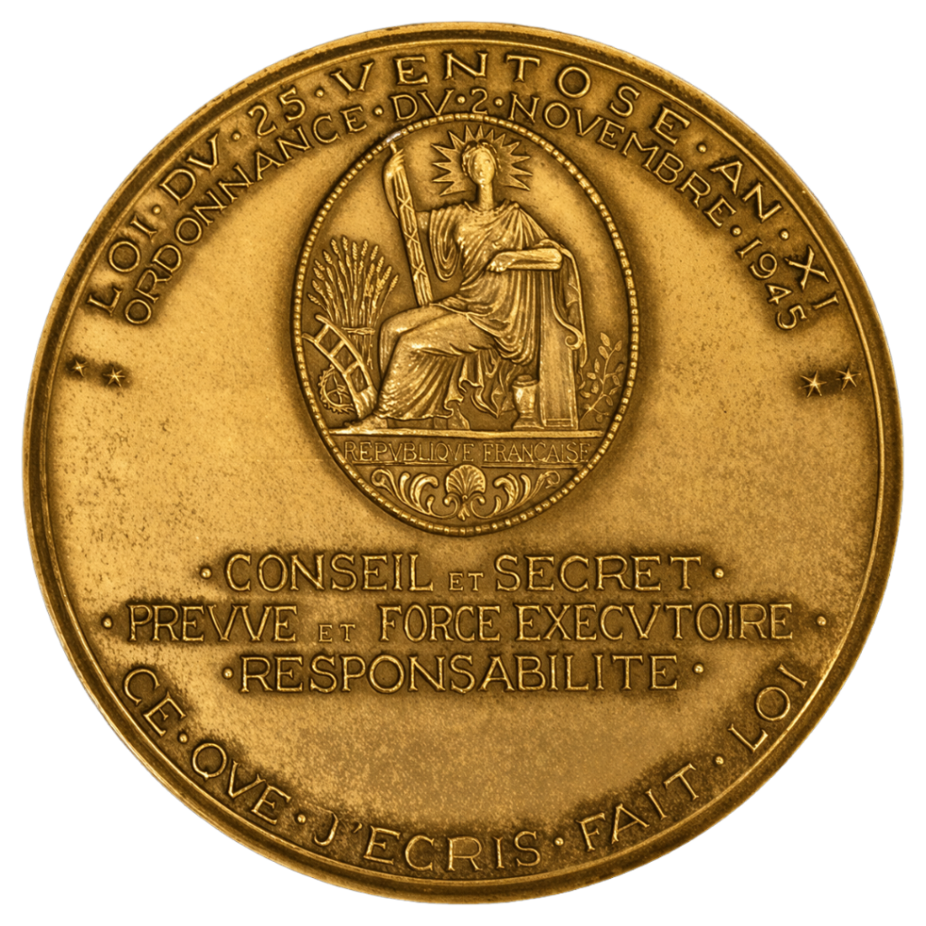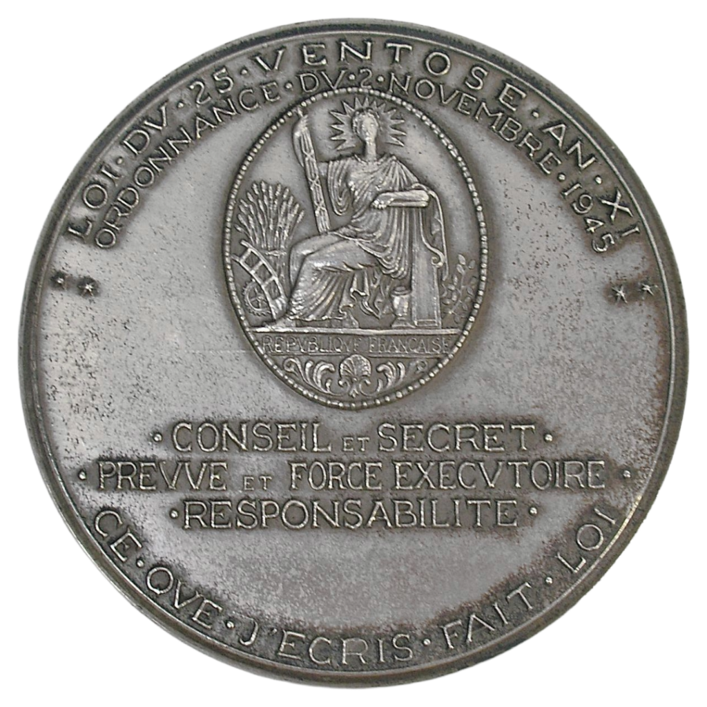L’Avocat s’inscrit dans l’ensemble des œuvres qu’Albert de Jaeger consacre aux grands corps juridiques. À travers une composition symbolique, elle évoque la défense, la parole et l’équilibre de la justice. Par son relief et sa rigueur formelle, cette médaille traduit la responsabilité de l’avocat dans la protection des droits et la recherche de l’équité.
